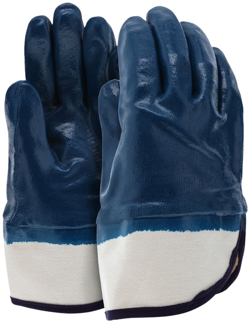 Nitrile-coated cuff gloves, full-hand coverage, oil- and liquid-resistant, ideal for wet work.